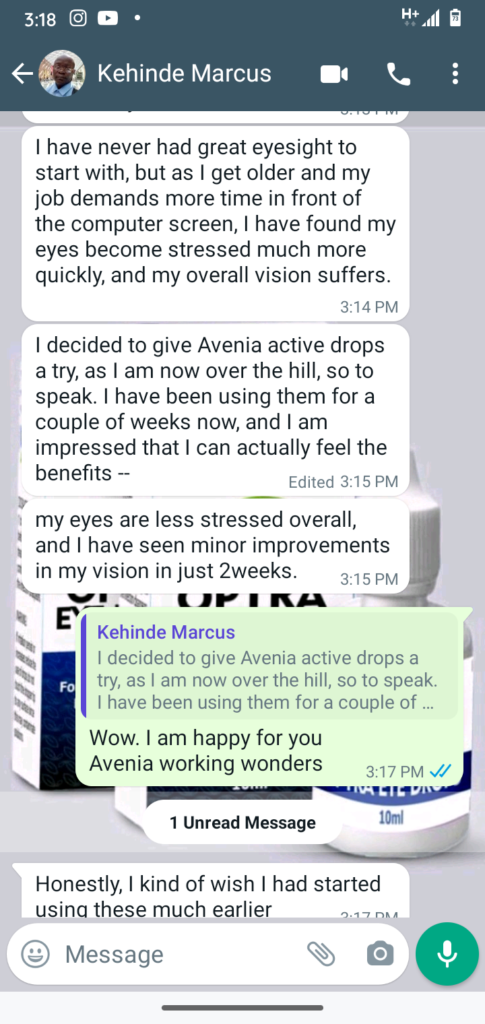 I can not stay in a room with light for up to 2hours. I will need to off the light. This was because light easily affected my eye sight. When i told my doctor about this, he then introduced avenia active to me to start using. He told me i will be cured. After using this product fir just 1 week, my eye problem stopped. I can now stay in a room with light and it will not affect my eyes